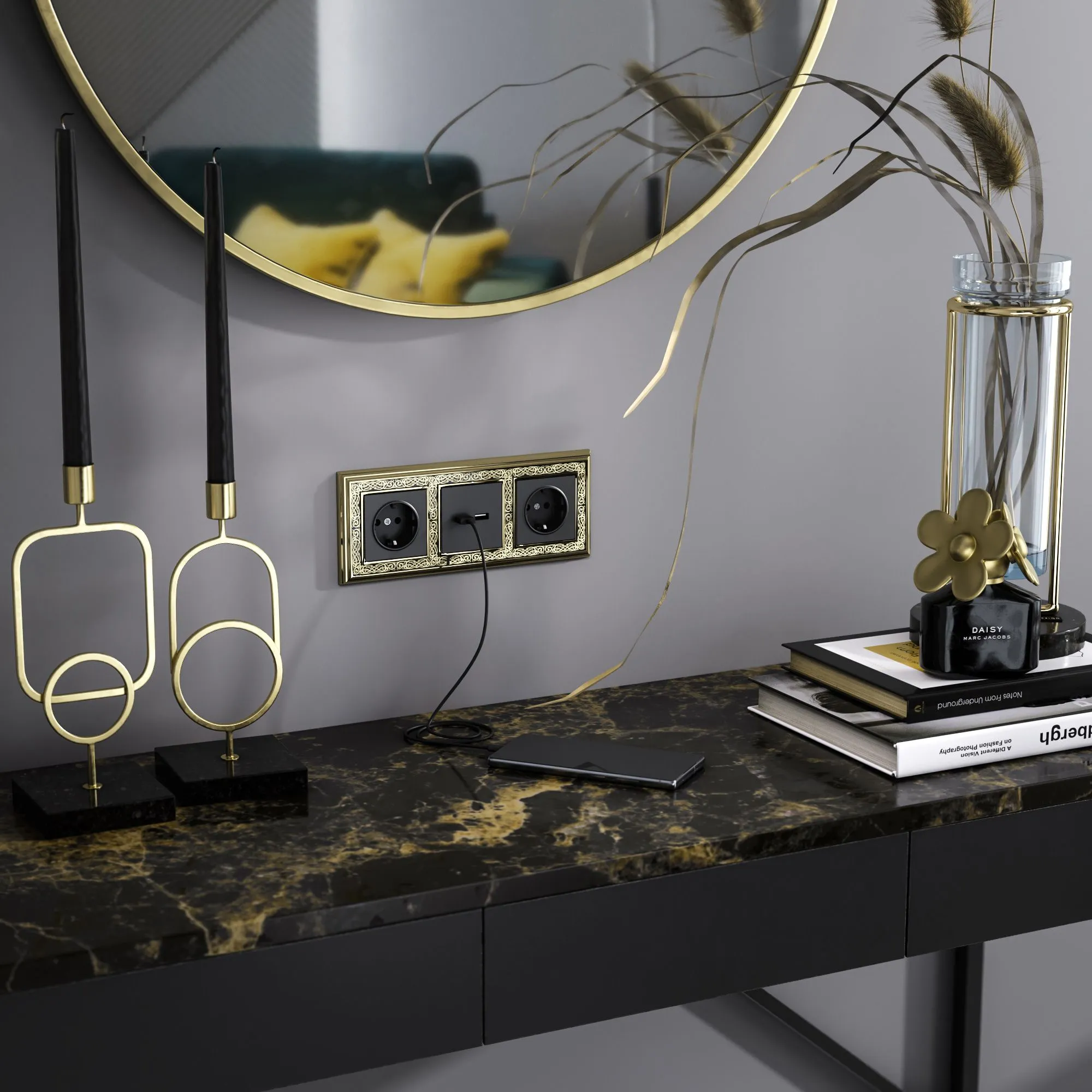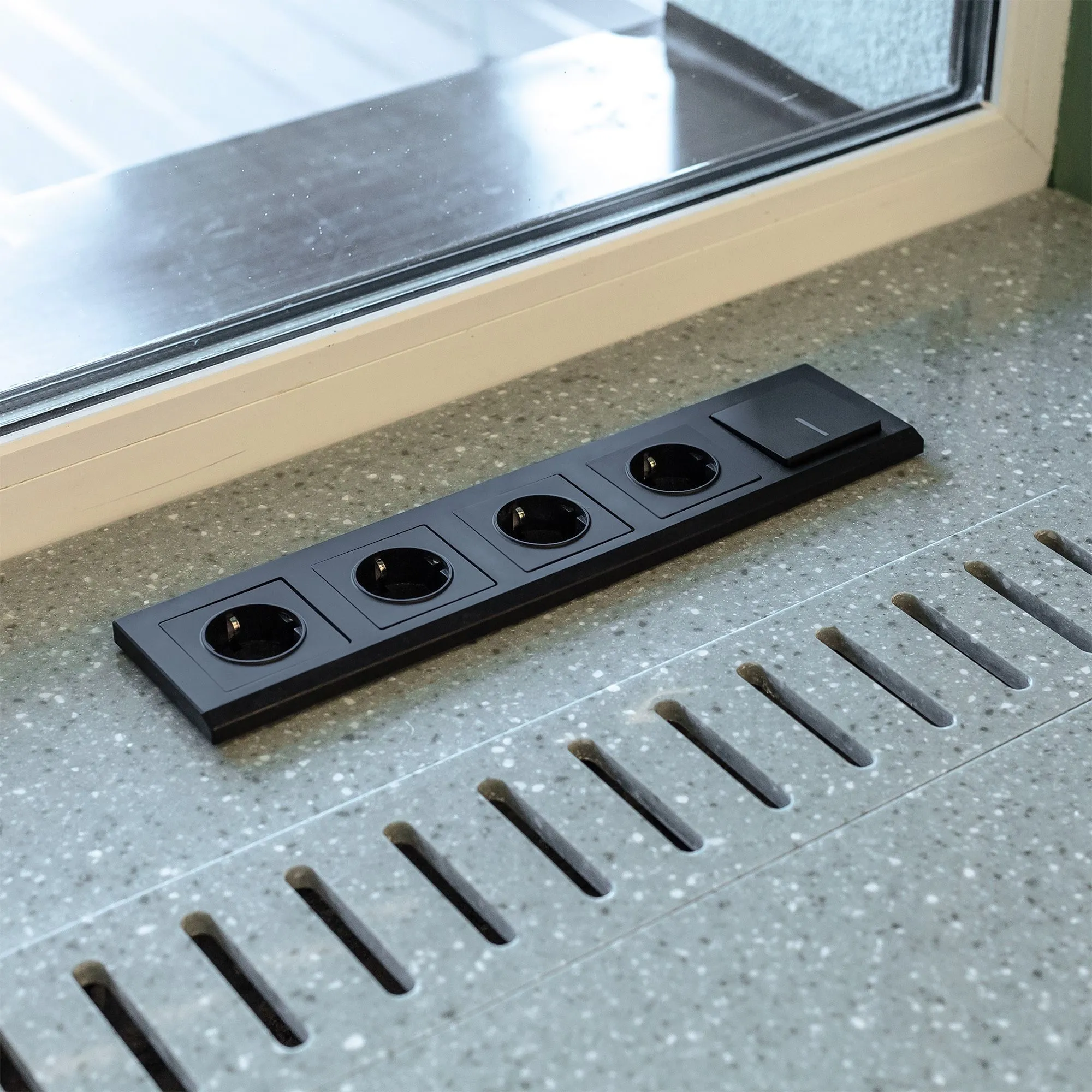 Лицевая панель выполнена в матовом черном цвете с бархатистой фактурой и тактильной мягкостью. Такая поверхность не бликует, не притягивает пыль и идеально вписывается в любые стили — от скандинавского минимализма до лофта и классики. Черный цвет гармонично сочетается с любыми отделочными материалами, а универсальная совместимость со всеми рамками Werkel позволяет создавать индивидуальные композиции под ваш вкус.