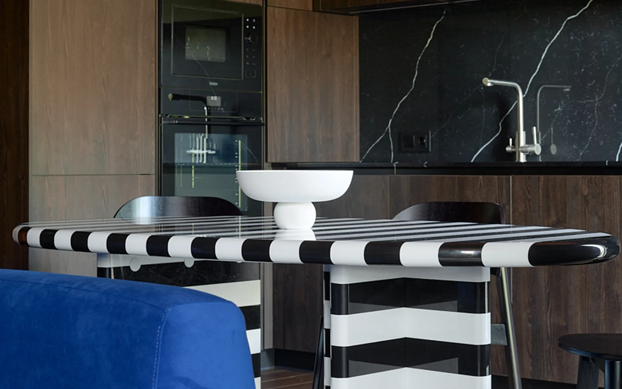 Основным цветом интерьера стал благородный терракотовый оттенок, который украшает потолок и стены, придавая помещению теплоту и спокойствие. Фактура дерева стала основным фоном для кухни, добавляя естественности и уюта. Яркие акценты внесли диван в насыщенном ультрамариновом цвете и обеденный стол с эффектом Маккалоу. Благодаря глянцевой поверхности, черно-белая столешница отражает окружающий интерьер, создавая оптическую иллюзию и дополняя общую концепцию .